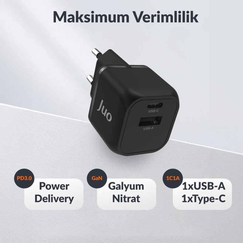 Juo G201C1A 20W GaN USB-C + USB-A Şarj Aleti iPhone & iPad & Android & Samsung & Xiaomi Uyumlu PD QC4.0 Type-C Hızlı Şarj Cihazı desteklediği protokoller sayesinde bir çok cihaz ile uyumluluk sağlamaktadır.20W çıkış gücü ile uyumlu tüm telefon, tablet gibi cihazlarınızda güvenle kullanabilirsiniz.