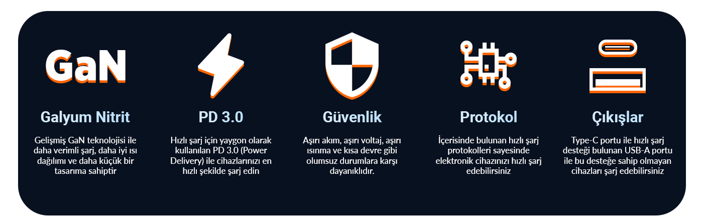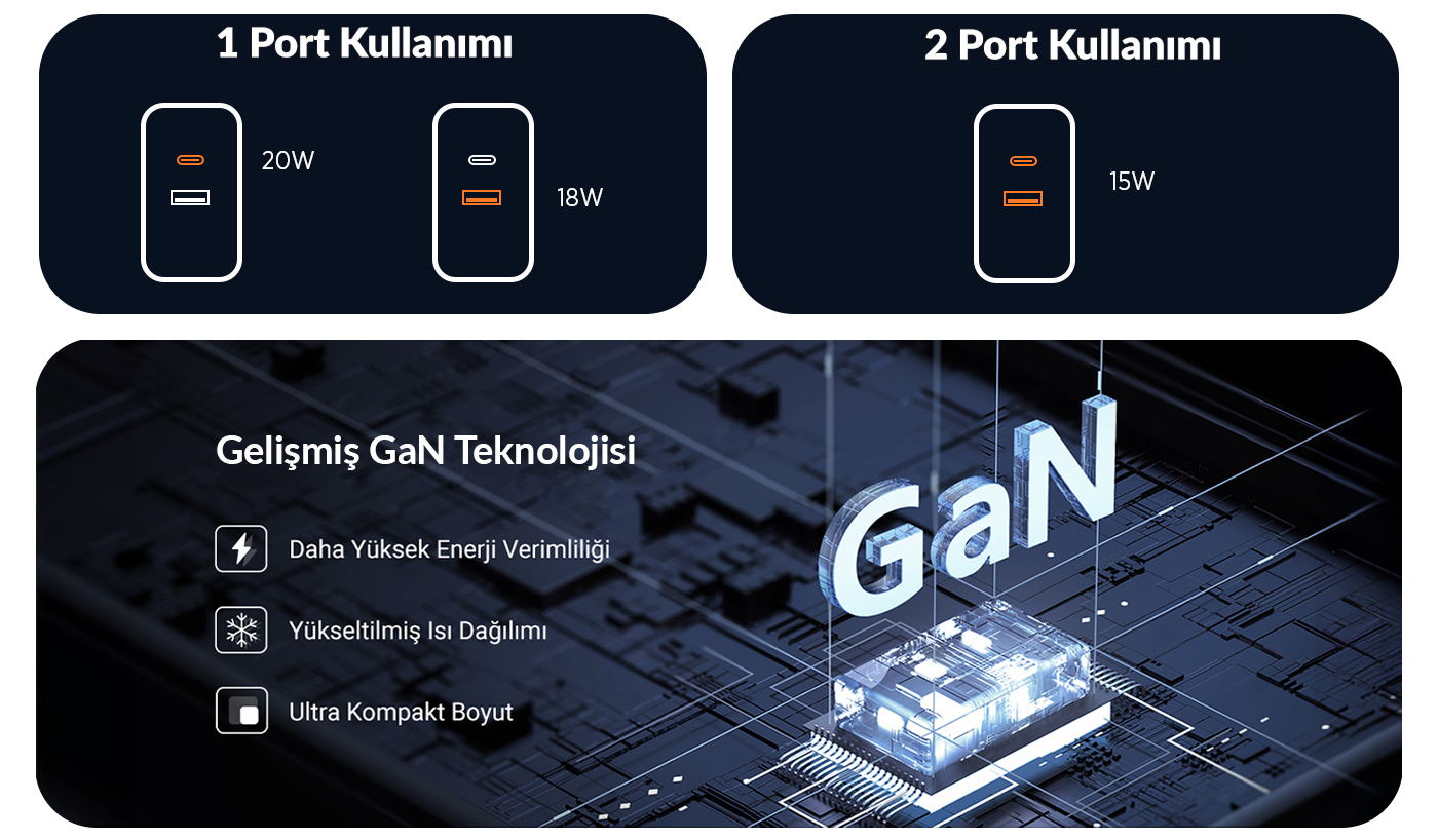 Juo G201C1A 20W şarj cihazında Type-C portu tek başına kullanıldığında 20W, USB-A portu tek başına kullanıldığında 18W ve her iki portta aktif kullanıldığında toplam 15W güç çıkışı sağlayacaktır. GaN teknolojisi ile şarja taktığınız cihazlar yüksek hızlarda şarj olurken ısınma probleminin de önüne geçilmektedir. Juo G201C1A 20W GaN PD şarj cihazını iPhone, iPad, Samsung, Xiaomi, Apple ürünlerinde güvenli bir şekilde kullanabilirsiniz. GaN teknolojisi sayesinde iPhone, iPad, Android cep telefonu ve tabletlerde cihazınızın çekebileceği akımı ve voltajı cihazdan aldığı geri bildirim ile cihazınıza gereken maksimum gücü verecektir. Bu sayede şarj süresini düşürerek ve cihazlarınızı aşırı akım ve ısınmadan koruyarak şarj işlemini gerçekleştirecektir.