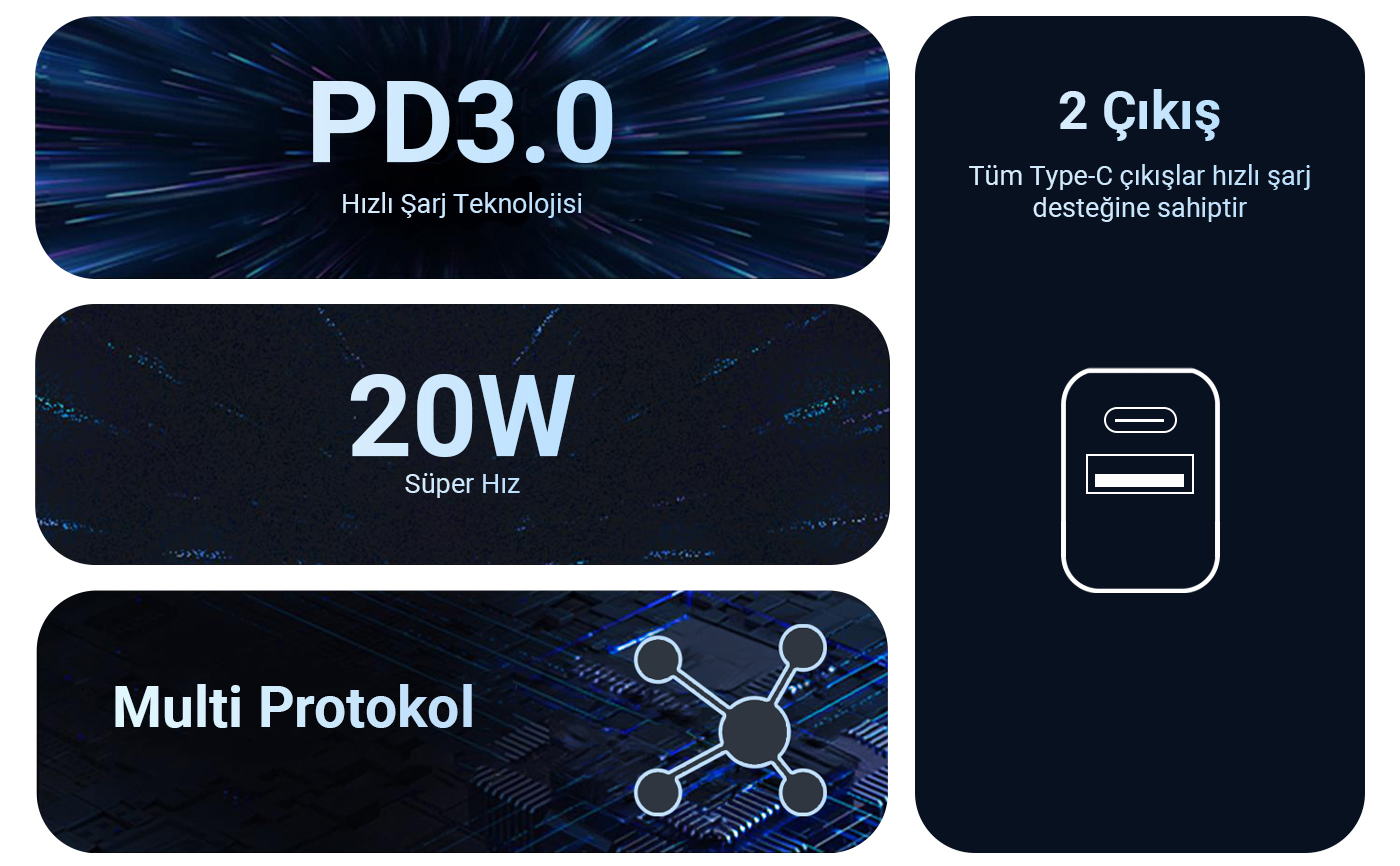 Desteklenen Şarj Protokolleri :PD3.0 / Apple 5V 2.4A / QC3.0 / QC4.0 / AFC / FCP / SCP / DCP