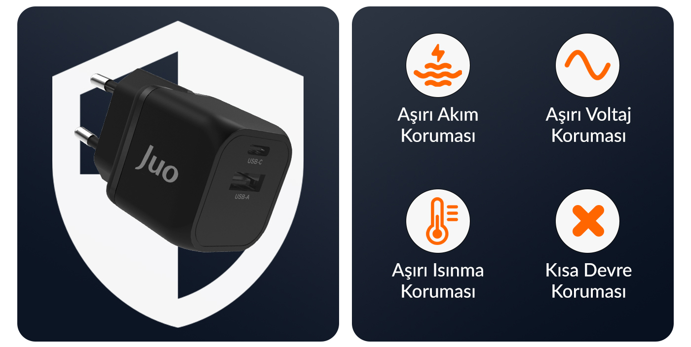 Juo G201C1A 20W USB-A + USB-C şarj aleti entegre akıllı devre tasarımı ile aşırı akım, sıcaklık, kısa devre, düşük –yüksek voltajlara karşı koruma sağlamaktadır. Cihazlarınızı şarj esnasında kapsamlı koruma sağlayarak güven altında tutar. Alev gecktirici plastik kasası düşmelere, darbelere karşı dayanıklıdır.