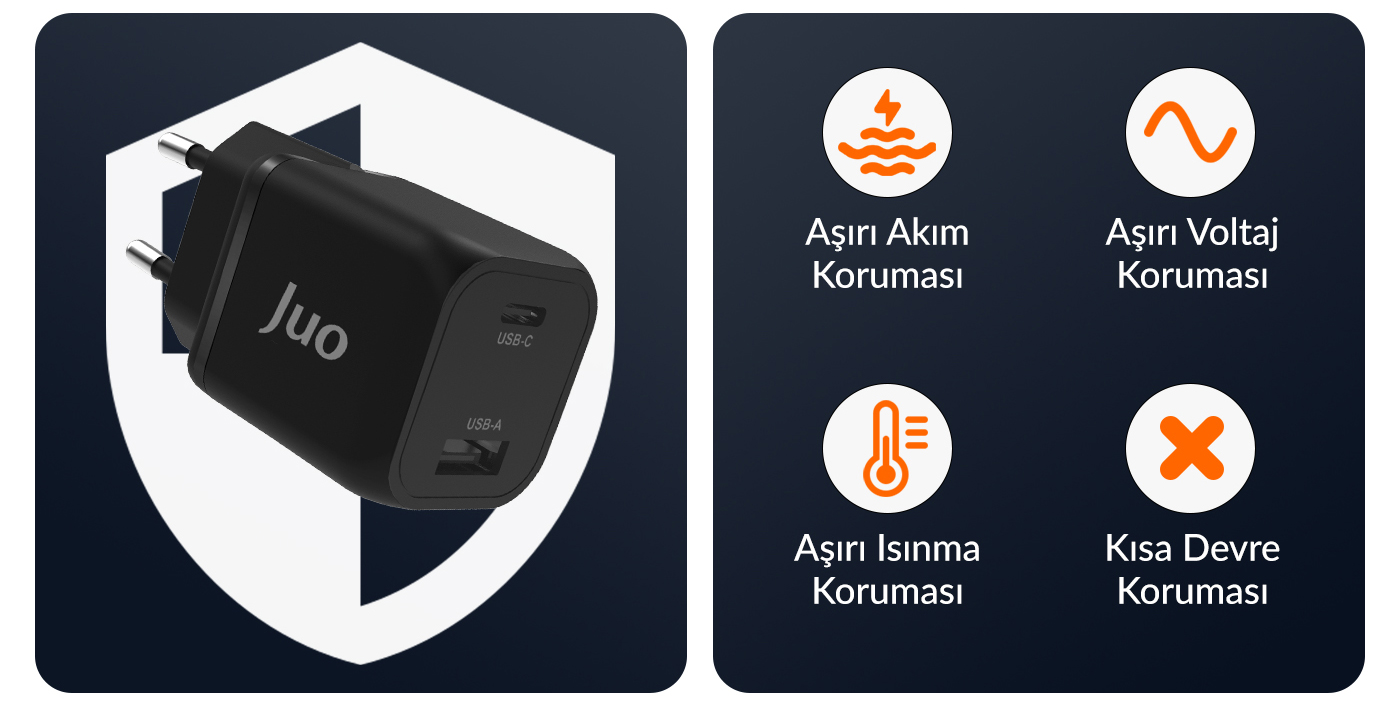 Juo G351C1A 35W USB-C + USB-A şarj aleti entegre akıllı devre tasarımı ile aşırı akım, sıcaklık, kısa devre, düşük – yüksek voltajlara karşı koruma sağlamaktadır. Cihazlarınızı şarj esnasında kapsamlı koruma sağlayarak güven altında tutar. Alev gecktirici plastik kasası düşmelere, darbelere karşı dayanıklıdır.