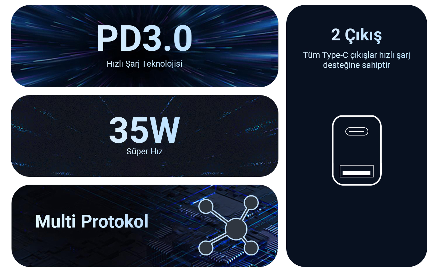 Juo G351C1A 35W GaN USB-C + USB-A çıkışları sayesinde aynı anda birden fazla cihazı hızlı ve güvenli bir şekilde şarj edebilirsiniz. Gelişmiş şarj protokolleri (PPS, PD3.0, QC4.0, AFC, vb.) ile uyumludur ve aşırı akım, sıcaklık, kısa devre gibi koruma protokolleri ile cihazlarınızı güvence altına alır.